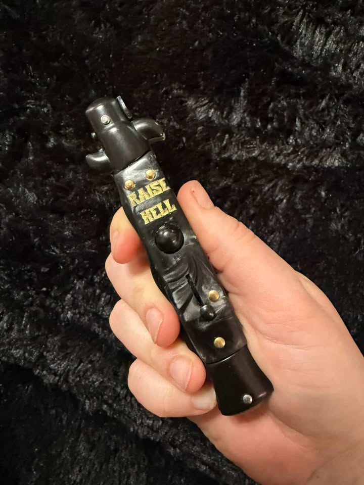 hand painted custom blade with flames and raise hell art. allow 7-12 business days to ship! thank you for your support